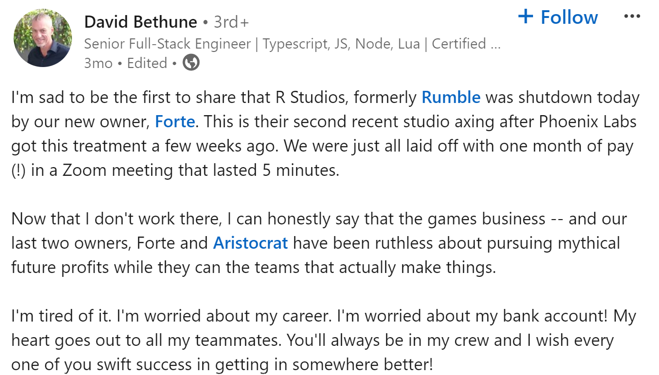 Rumble Games met a swifter end, closing entirely in July, just four months after its acquisition. Former employees described their experience as a "shitshow," citing minimal communication from Forte and confusion over employment status during the transition period. Engineer David Bethune denounced on LinkedIn the "ruthless" behavior of Rumble's previous owners in their pursuit of "mythical future profits."