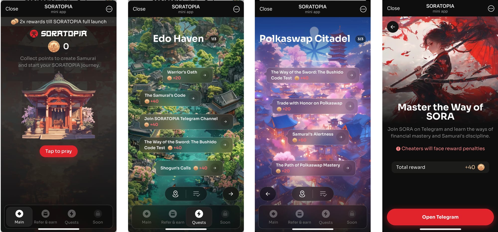 The new samurais are expected to check in up to six times a day to earn rewards via passive ‘praying.' They can invite friends, complete quests, and participate in community contests. The mechanics are very similar to Blum, which also doesn’t require users to fiercely tap on the screen.
