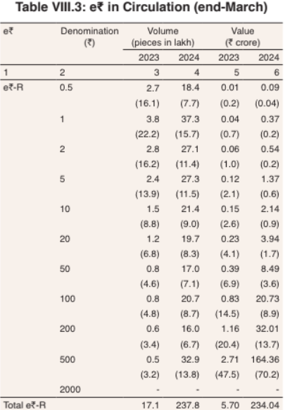Unexpectedly for a digital currency, the retail facing e-rupee has fixed denominations and the following table shows the distribution of the total value among those digital coins.