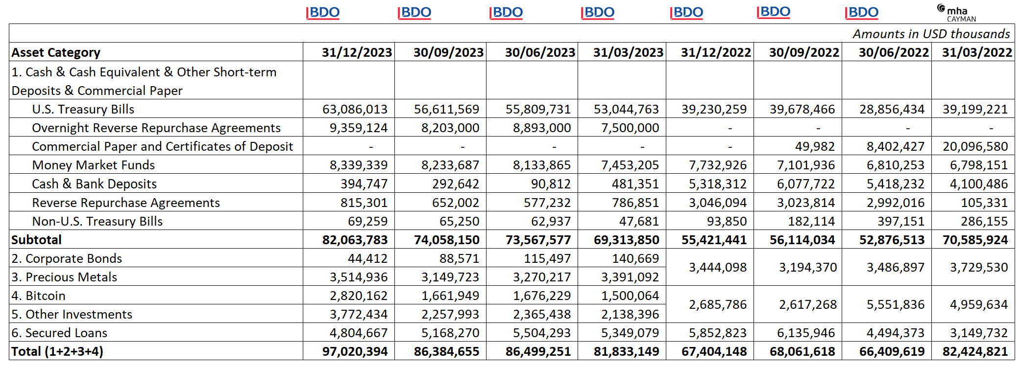 The main reserve categories rose in line with the stablecoin issuer's increased capitalization. The Bitcoin and Other Investments categories (presumably crypto) have almost doubled since the beginning of the year; however, most of the increase is attributable to the price increase of the underlying assets.