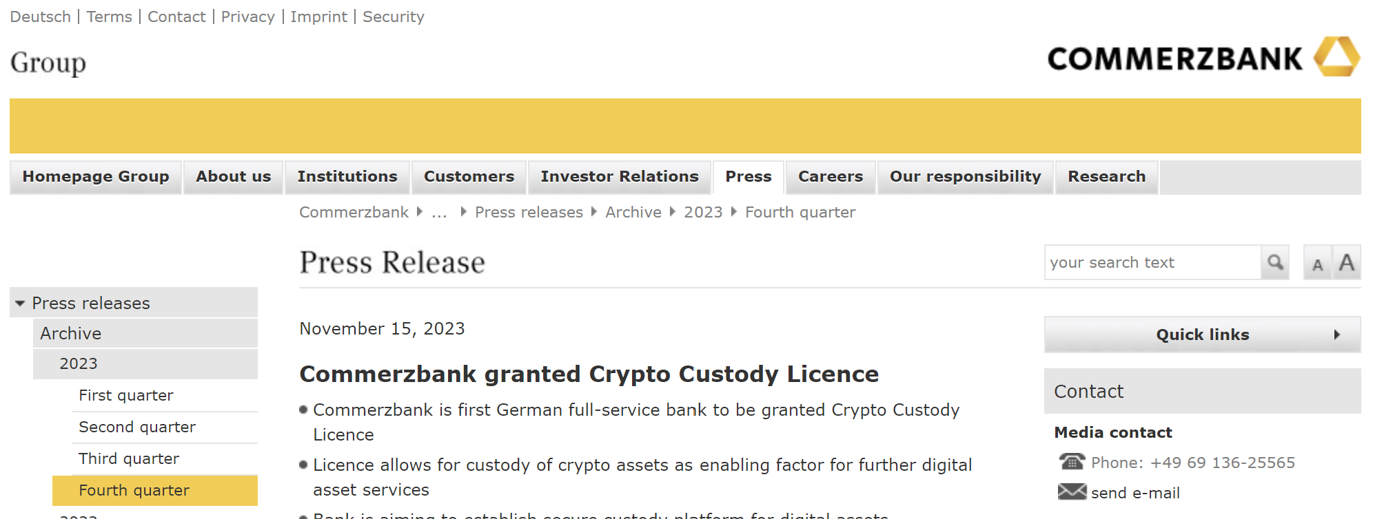 Finally, Commerzbank has been granted a crypto custody license in its native Germany. Commerzbank claimed to be the first full-service bank to receive such a license from regulators.