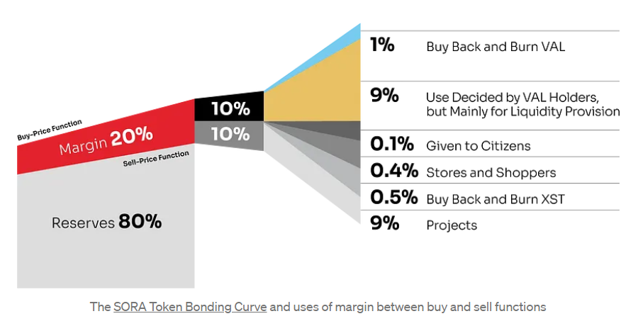 The unique feature of SORA's token bonding curve is a margin between the selling and buying functions.