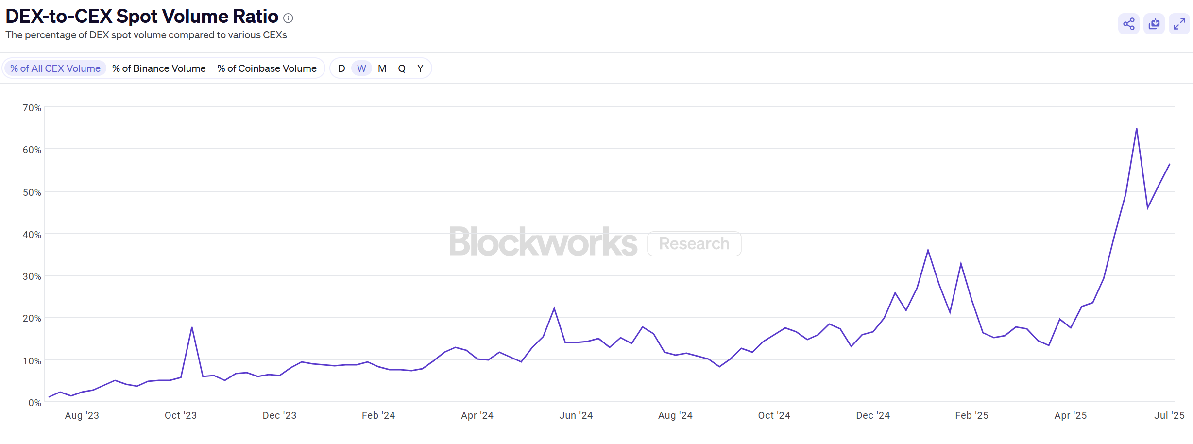 Decentralized exchanges just hit a record high, with DEX-to-CEX spot volumes reaching parity for the first time. The middle-tier altcoin sector, once central to CEX activity, is losing ground. Meanwhile, a new generation of CLOB-based DEXs is preparing to reshape the landscape of crypto trading.