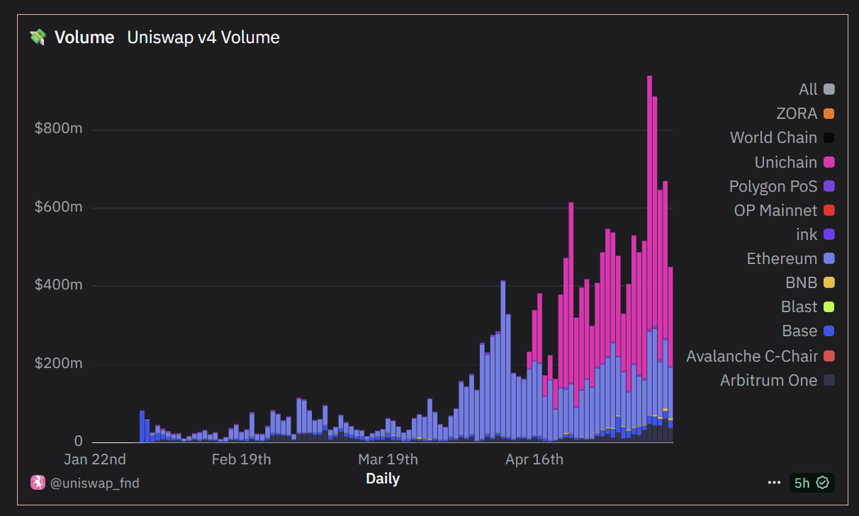 Surprisingly, even the Uniswap team didn’t expect this level of growth. Their initial KPI targets were $750 million in TVL and $11 billion in cumulative swap volume within three months. But those numbers were hit in under a month. On some days, Uniswap v4 alone is doing $500 million in volume.