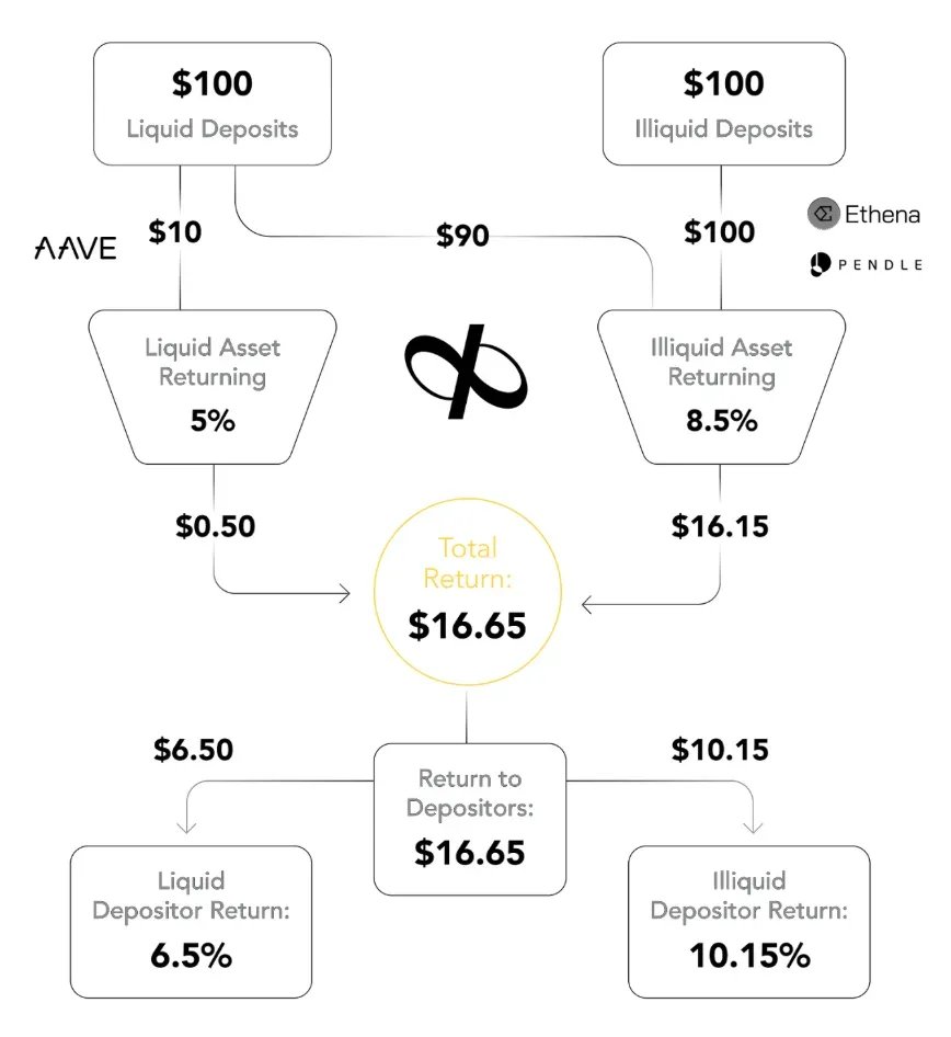 In one example presented in the whitepaper, up to 90% of a user's liquid deposit is allocated to higher-yield, illiquid positions such as Ethena and Pendle. The return from this investment—referred to as “duration assets” in the document—is then distributed between both liquid and illiquid depositors, boosting returns for all.