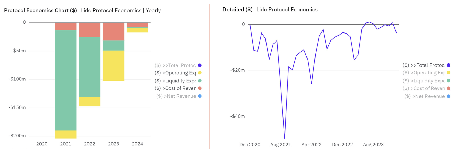 - Lido's annual costs are significantly higher than suggested. Actual costs were $100 million in 2023 and are projected to be $50-60 million in 2024, not $16 million.