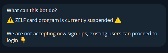 The card from ZELF is an interesting tool. They also give free NFT at registration. Sounds great. We decided to try the new product, but unfortunately, new users cannot register now. Telegram bot is now showing the following message:
