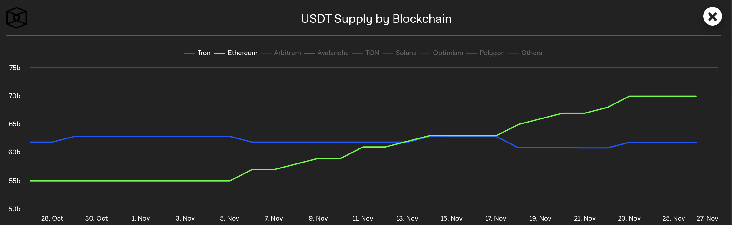 The gap only widened in the following days, as Tether minted $2 billion USDT on Ethereum and $1 billion on Tron on November 23, adding to the $10 billion minted earlier this month. Now, Tether’s data show that the net circulation on Ethereum is $8.5 billion more than that on Tron.
