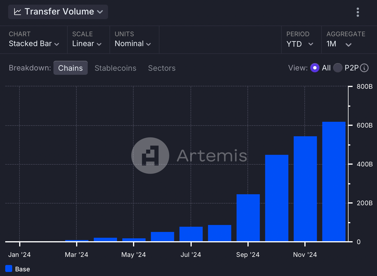 The Base blockchain has seen a dramatic surge in stablecoin activity and an overall growth of around 10x since June. Its daily transfer volumes reached a new ATH of $39.6 billion on December 17, while its monthly volume has already surpassed $622 billion.