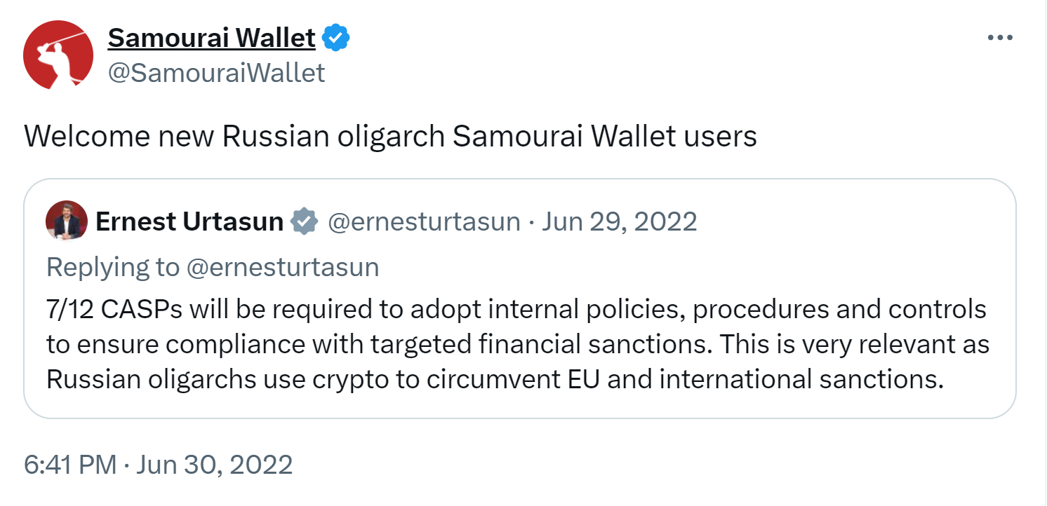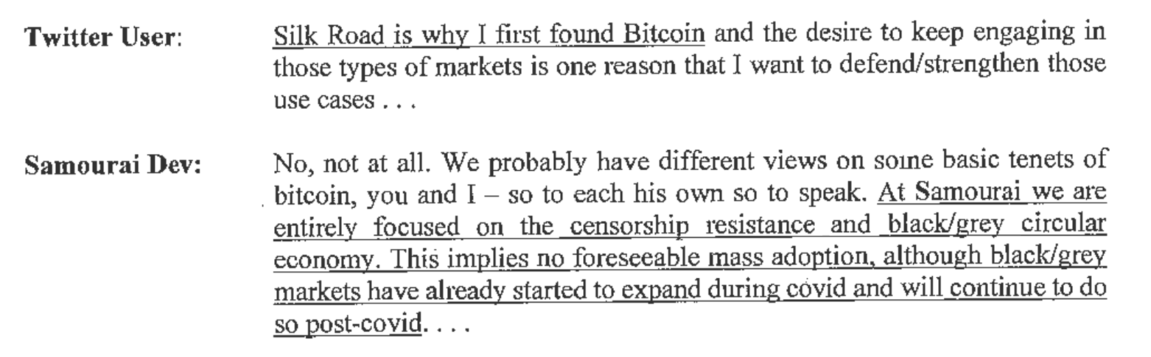 Prosecutors also claim that both founders were aware of the criminal nature of many Samourai users and "operated Twitter accounts that encouraged and openly invited users to launder criminal proceeds through Samourai." In a private message in August 2020, Hill, using the Twitter handle "Samourai Dev," acknowledged that Samourai Wallet caters to users involved in "black/grey markets" seeking to avoid financial regulations and safeguards.