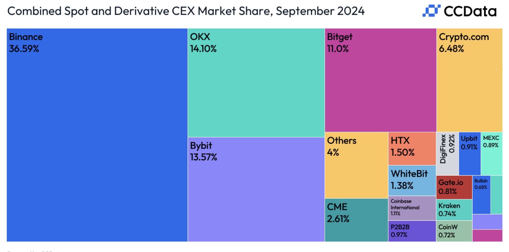 According to a CCData report, in September 2024, Binance, the world’s largest cryptocurrency exchange, experienced a notable decline in trading activity. This trend affected both spot and derivatives trading. Binance’s overall market share in combined spot and derivatives markets on centralized exchanges shrank to 36.6%, its weakest position in four years.