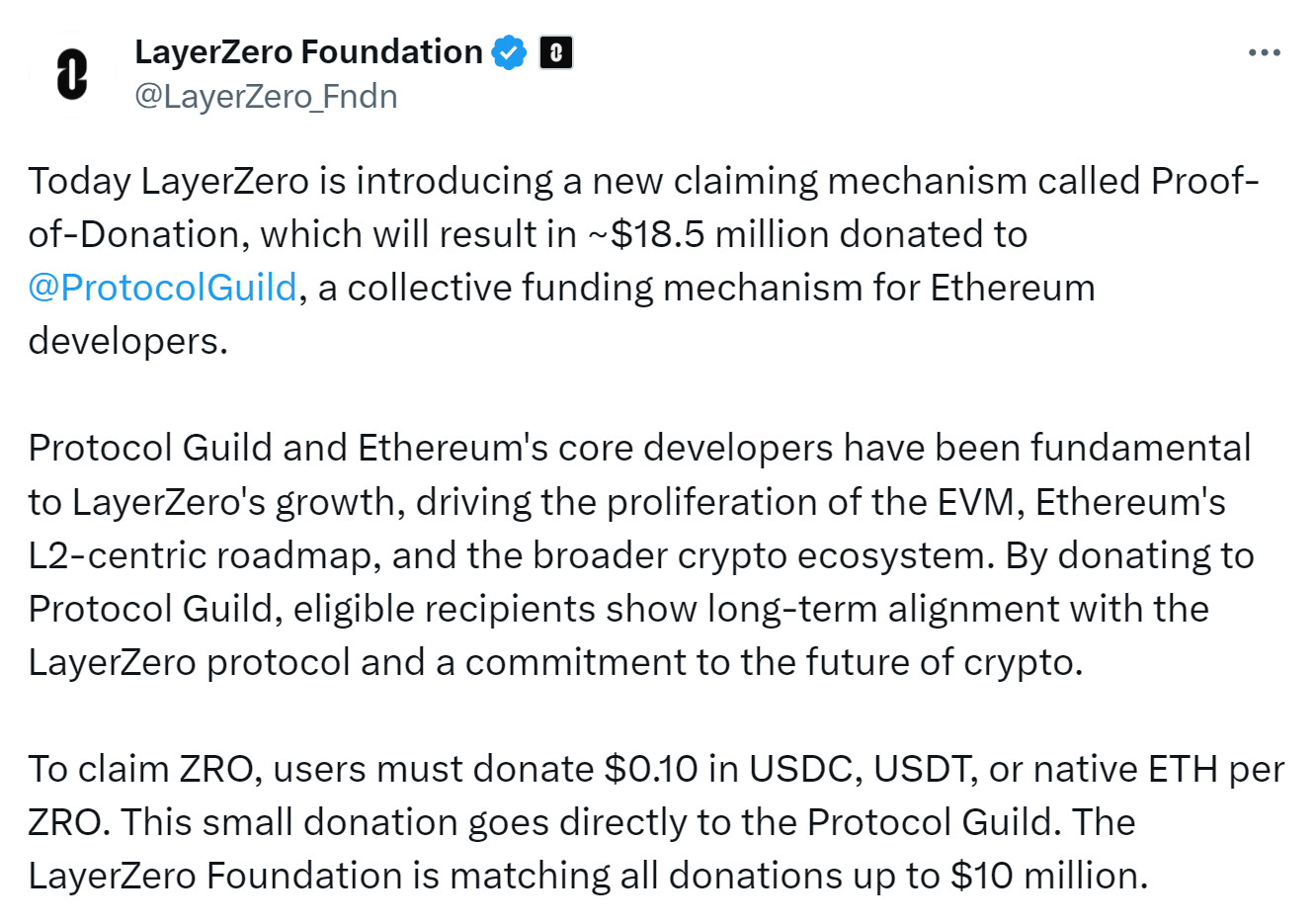 LayerZero's "not-airdrop" targeted early adopters who had interacted with the protocol before the snapshot taken on May 1, 2024. Unlike traditional airdrops, where tokens are freely distributed, participants are required to donate $0.10 per ZRO token to Protocol Guild, a collective funding Ethereum's core members. The LayerZero Foundation said it expects around $18.5 million in donations and said it will match all donations up to $10 million.