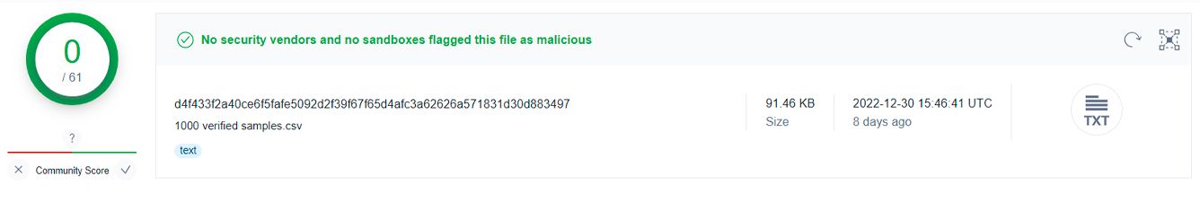 But, the link to “small sample that doesn't represent even 1% of the data" still works. This sample includes a database of 1,000 verified accounts. We managed to download this small database (exclusively for research purposes!). The database is hosted on a file-sharing service, has not yet been blocked and the number of downloads has already exceeded 7,500. If you believe the VirusTotal service, then there are no viruses in the file.
