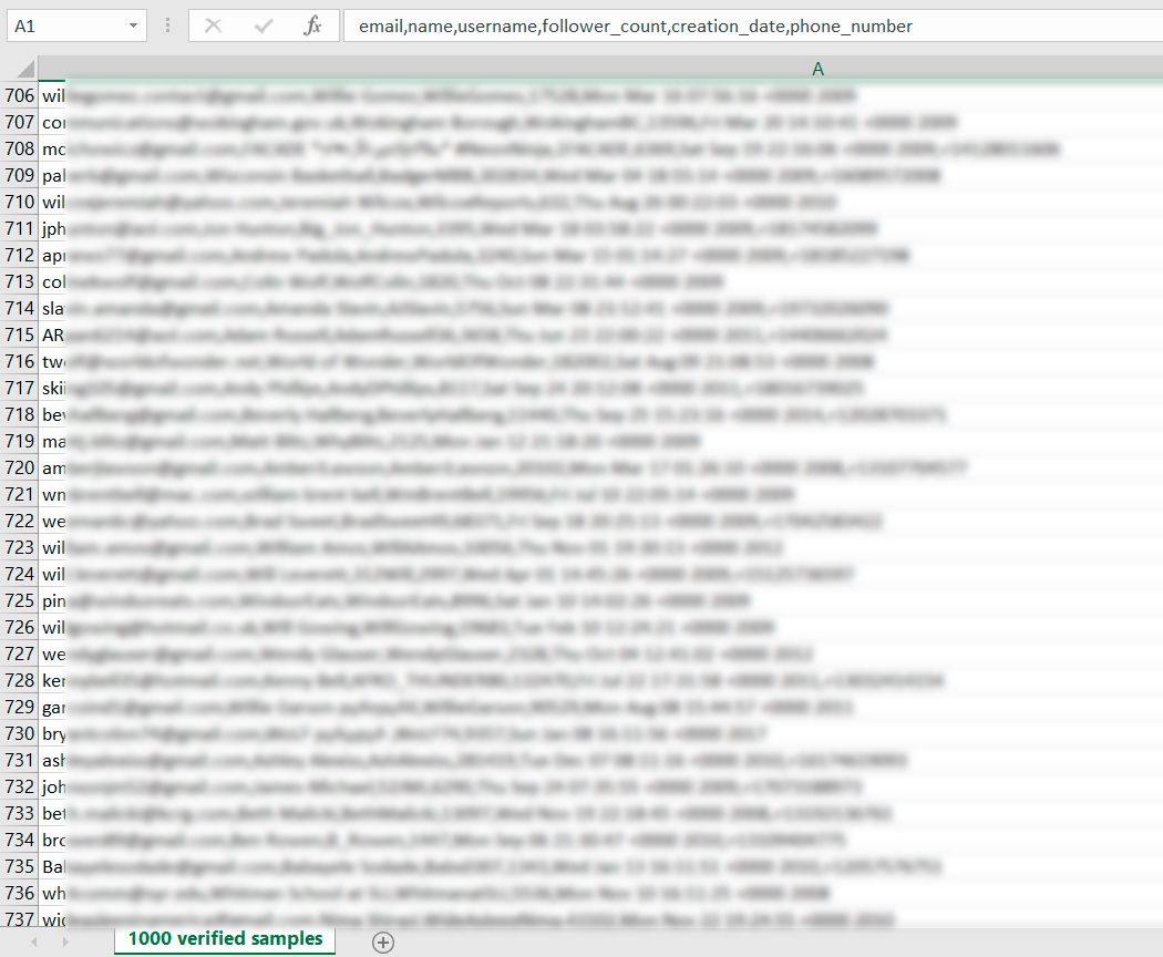 The database really contains 1,000 records, each of which includes email addresses, user names, number of subscribers, account creation dates and phone numbers. Of course, we will not share this database, because it is a crime.