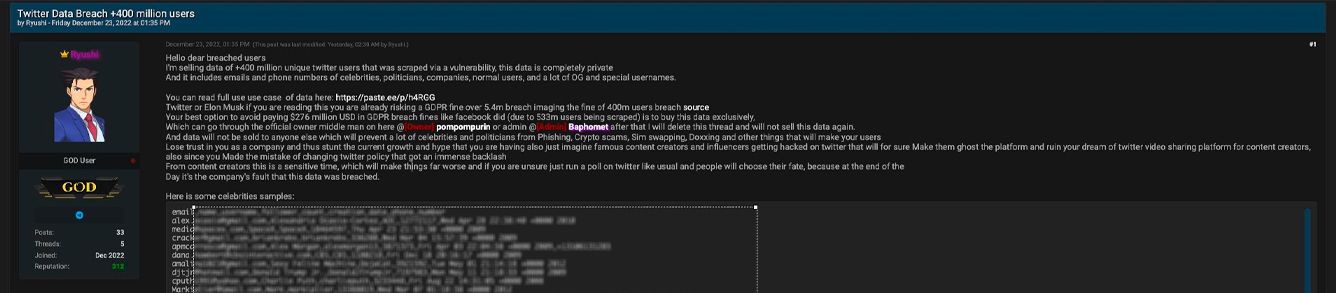 A hacker with the pseudonym Ryushi posted an ad on the Breached forum on December 23, in which he announced that he has a database of more than 400 million Twitter users. At the moment, there is no access to the hacker's original message. Only the screenshot remains.