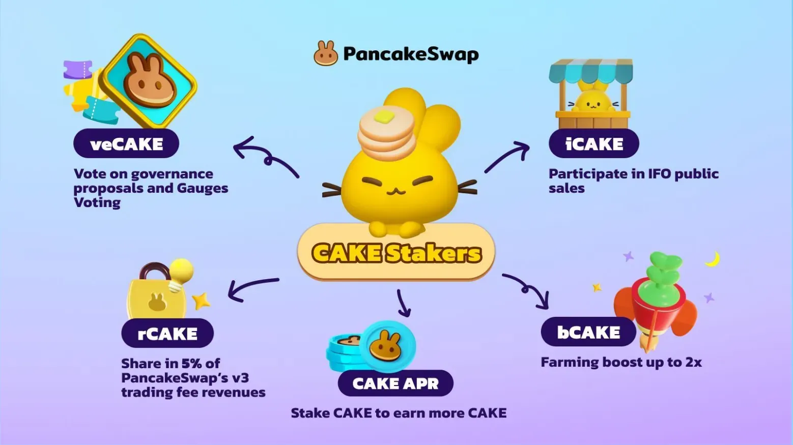 Right now, $CAKE holders can stake for up to four years to take part in governance and earn rewards through $CAKE staking and revenue sharing.
