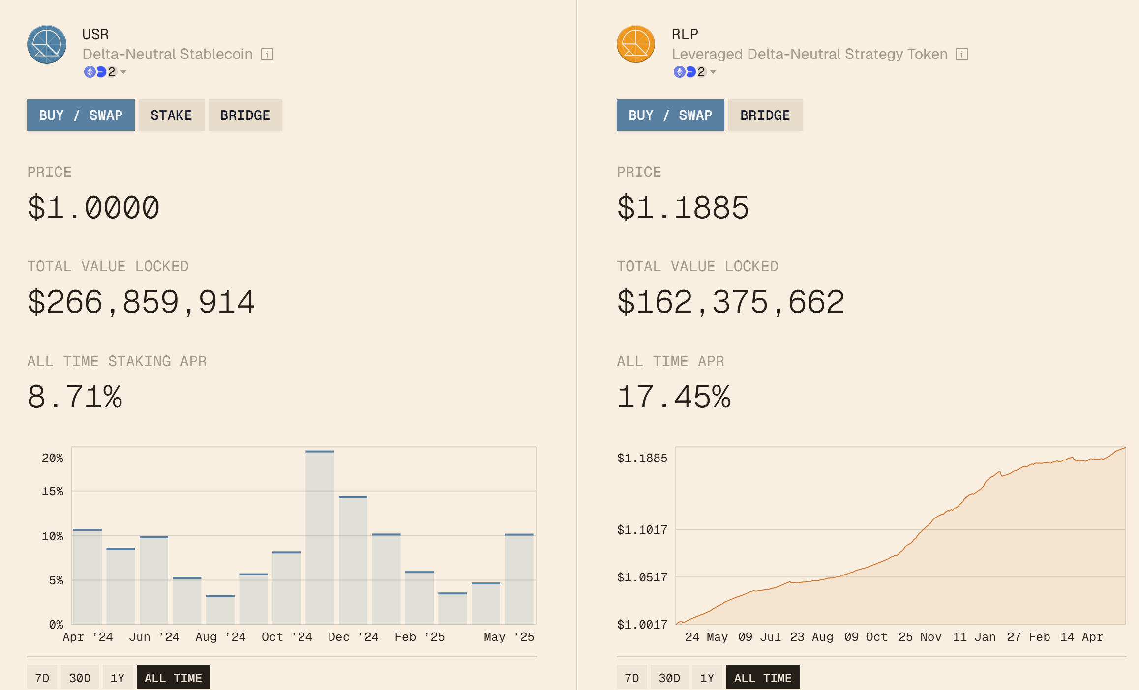 The returns are also different for the two tokens. USR currently has an all-time average return of 8.71%, while RLP offers about 17.45%. The higher return for RLP is because it carries more risk, such as counterparty risk, extended periods of negative funding rates, and other associated risks.