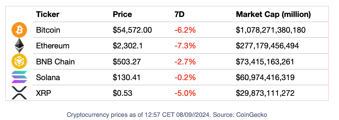 Crypto prices kept falling all through the week, with Bitcoin even tickling the $53K panic level on Saturday following the release of U.S. job data.