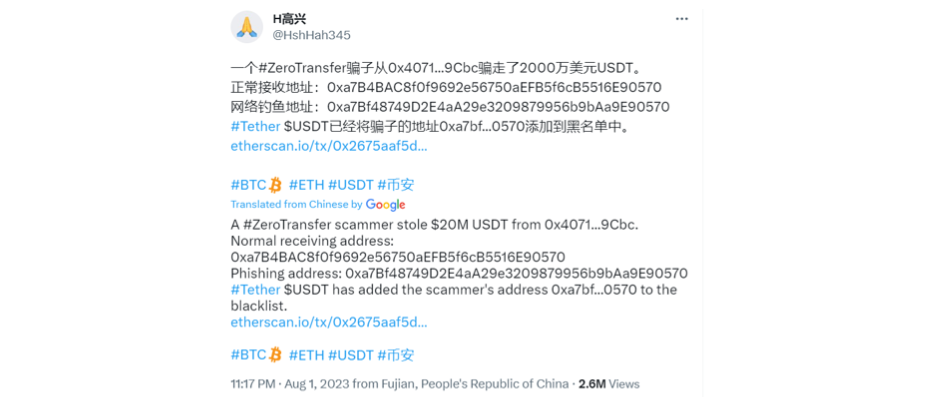 On August 1st, Tether prevented $20 million USDT from going to the wrong hands by blacklisting a hackers account shortly after they performed a zero-transfer scam.