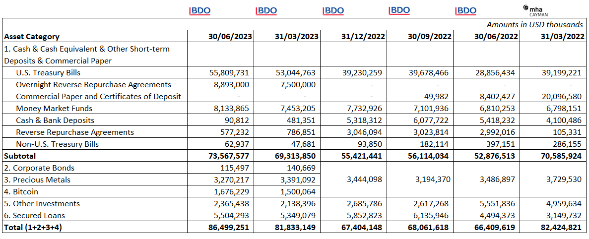 Most of the reserves went into buying U.S. government Treasury bills. The second largest increases were in Overnight reverse repurchase agreements and Money market funds. Due to a new disclosure that was added for the first time in this quarter's CRR, we learned that these two categories are also backed by U.S. government Treasury bills to almost 98% of their value.