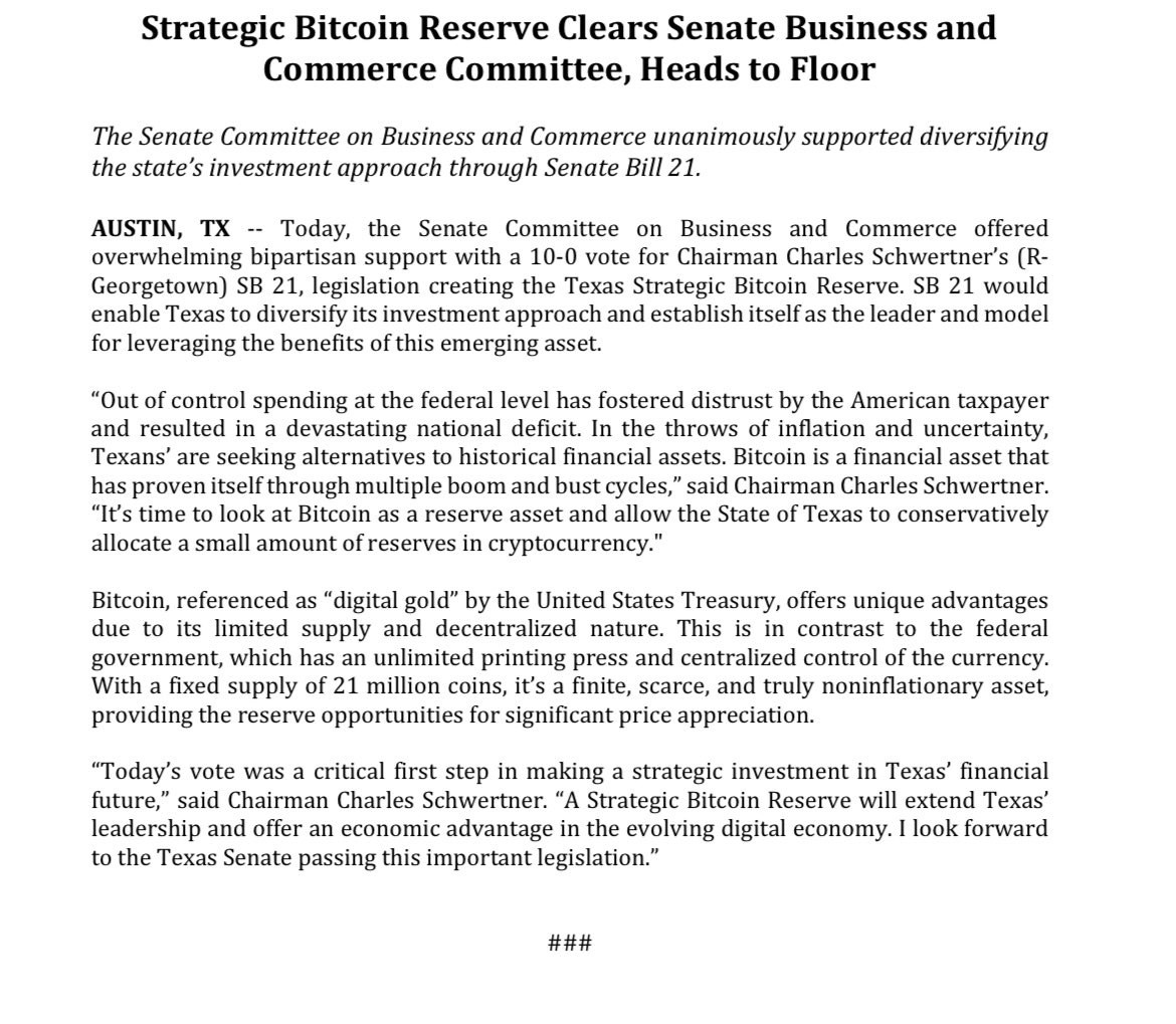 Lawmakers hope this will be a step toward making Texas a major crypto hub. You can read the full statement below: