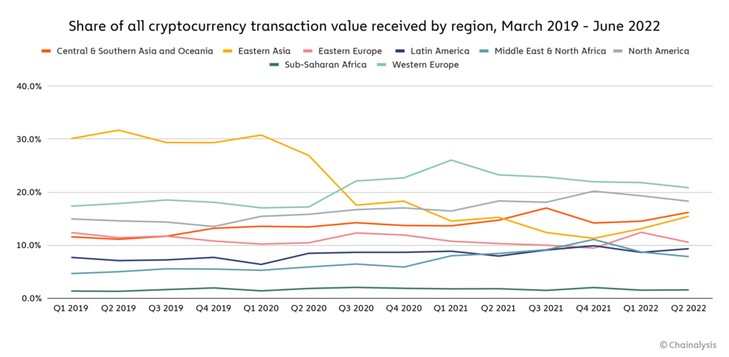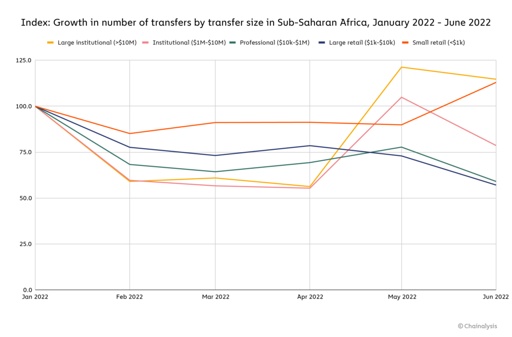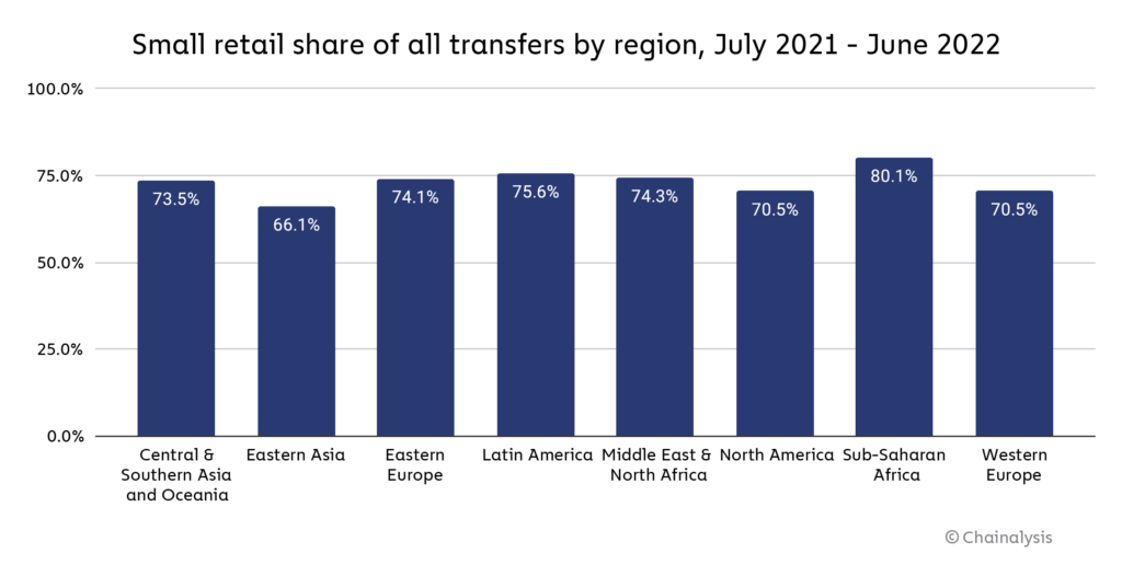 In Sub-Saharan African countries, retail transfers up to $10,000 USD account for 6.4% of total transactions. And the share of retail transfers up to $1000 is more than 80%, which, according to Chainalysis, is more than in other regions.