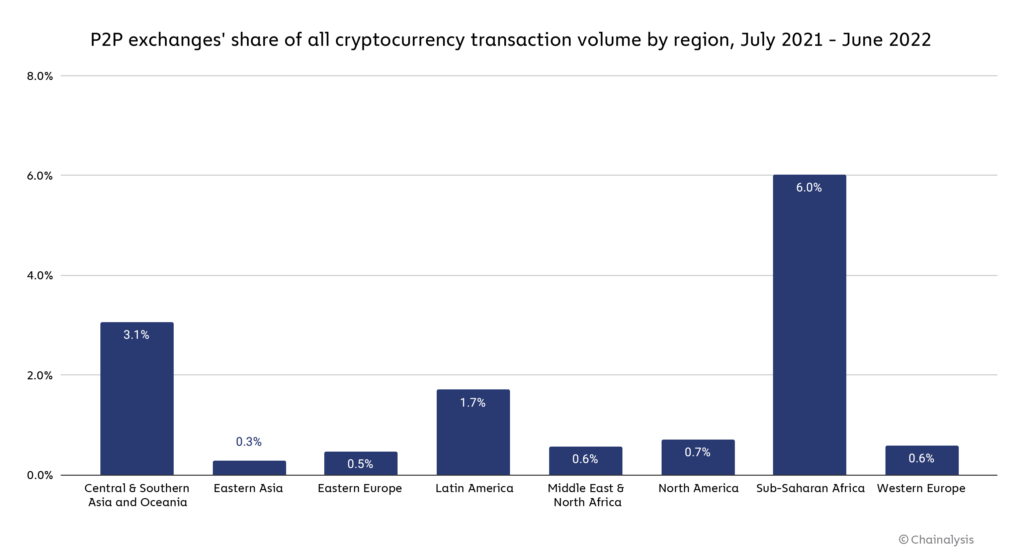 Also, in Sub-Saharan African countries, there is an increase in the popularity of P2P exchange. 6% of the total volume of P2P transactions are P2P exchanges in Sub-Saharan Africa countries. This is twice as much as in another regions on the Chainalysis list – Central & Southern Asia and Oceania.