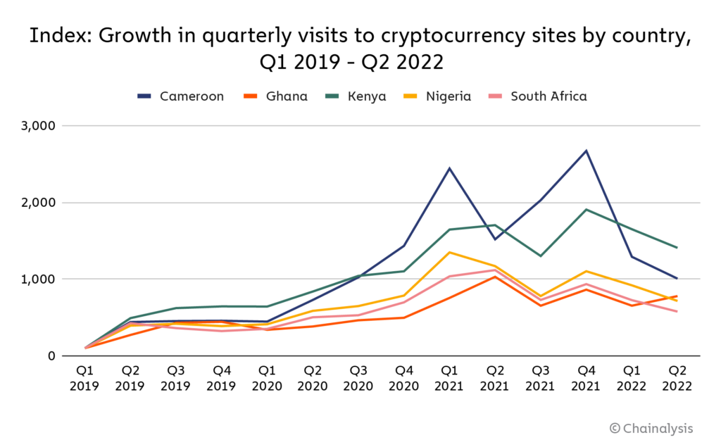 Over the past three years, there has also been an active growth in visits to cryptocurrency sites. In general, the number of users visiting cryptocurrency sites is growing across Africa. Cameroon, Kenya and Ghana occupy the leading positions in the chart.