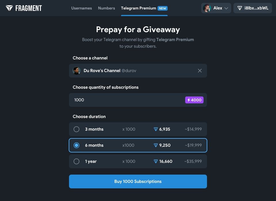 And, just in case you think we’ve forgotten, this is where it all connects back to TON. You see, to start a Giveaway, the organizer must first pay for the premium subscriptions they want to… erm, give away. This can be done through the Telegram app, but for bulk purchase is cheaper through TON marketplace, Fragment.