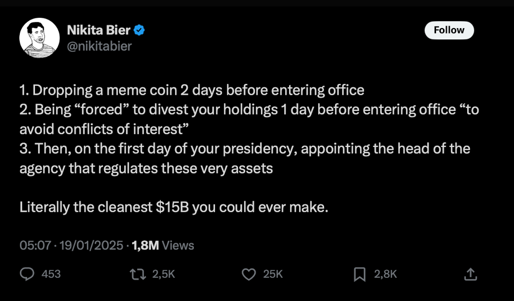 Analysts, on the other hand, pointed to how illegal the whole affair would have been if it had been done by anyone else or even by the President himself at any other time than not the long weekend that preceded the inauguration: the U.S. Constitution prohibits presidents of profiting from the presidency - meaning that the launch could not happen after the inauguration - and, even if securities laws were broken by the launches during the weekend, Trump is now protected from being held accountable due to presidential immunity.