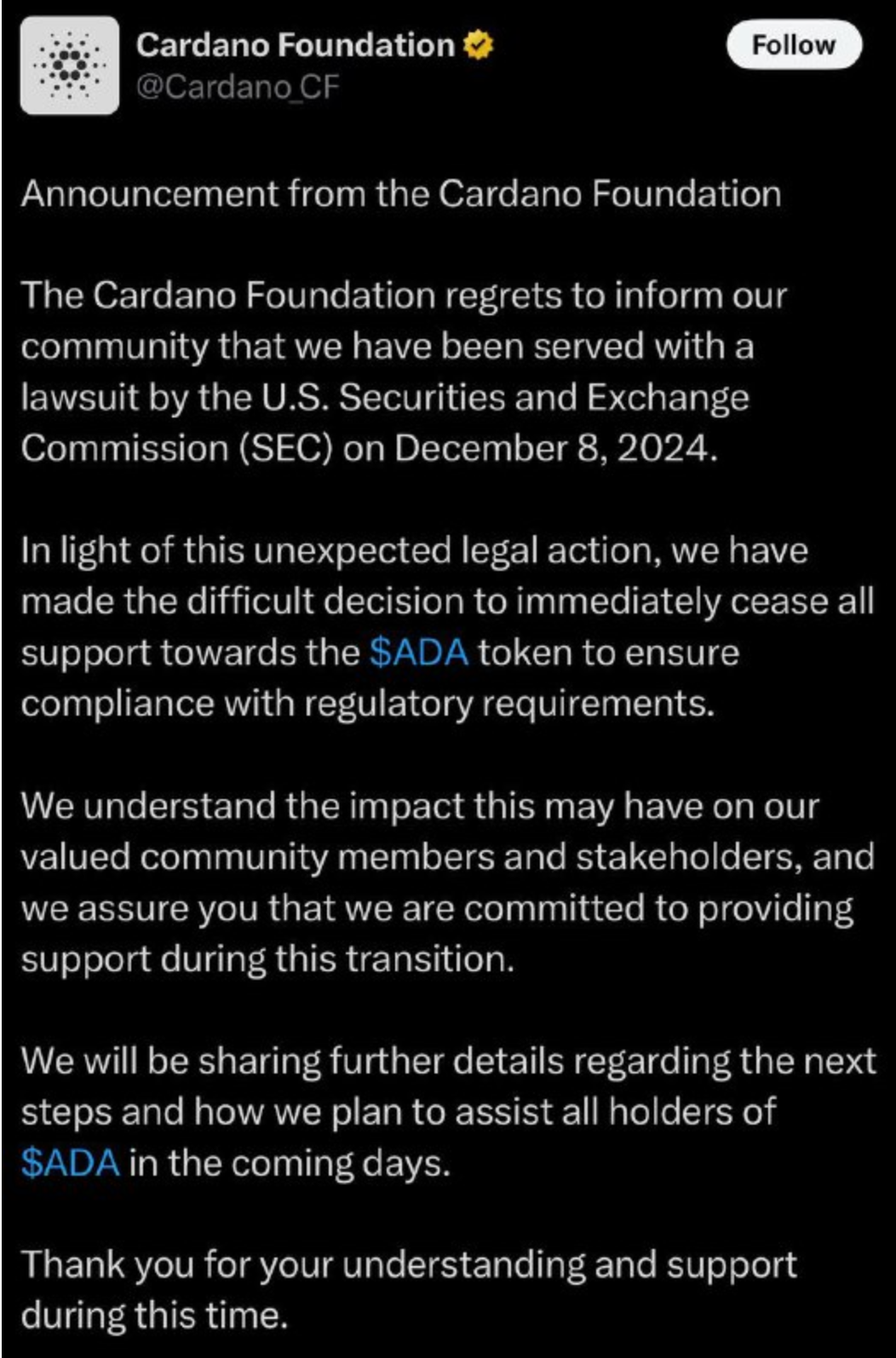 On Sunday, the Cardano Foundation's X account was hacked to (again) promote a fictitious token, ADAsol. Later, the scammers published a claim falsely stating that the organization would cease support for the ADA token after being served a lawsuit by the United States Securities and Exchange Commission.
