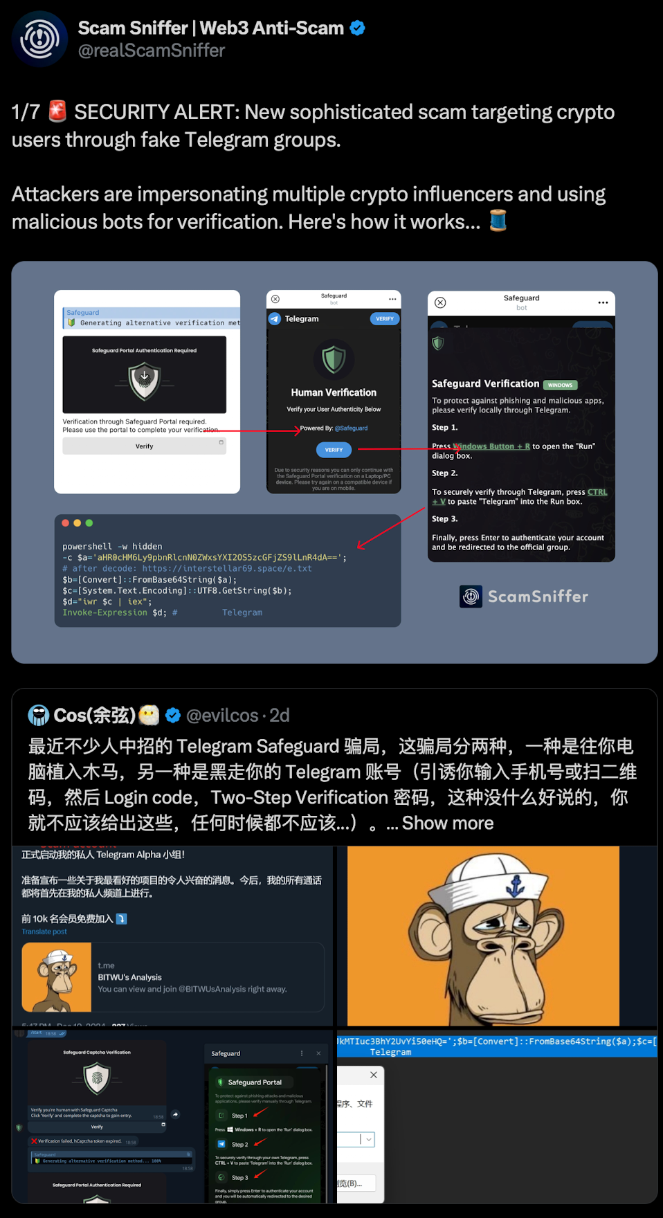Attackers impersonate crypto influencers on social media to lead their followers towards Telegram channels where they promise to share exclusive investment advice, but once users join in, they are asked to verify their identity through fake Safeguard bots that immediately inject malicious code into their clipboards.