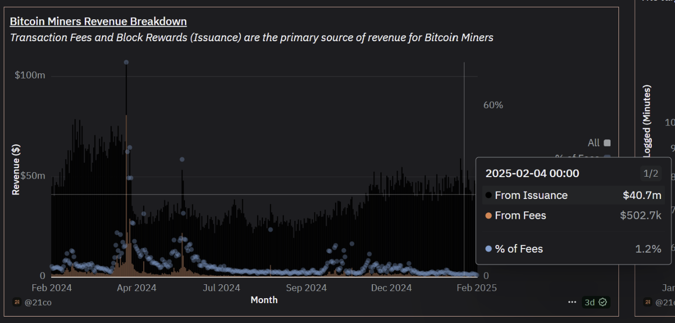 For those unfamiliar with Bitcoin’s security model, it largely depends on miners who validate transactions and add blocks to the blockchain, receiving rewards in return. Currently, miners earn 3.125 BTC per mined block, which comes from supply inflation. Additionally, they receive transaction fees from the transactions included in the block.